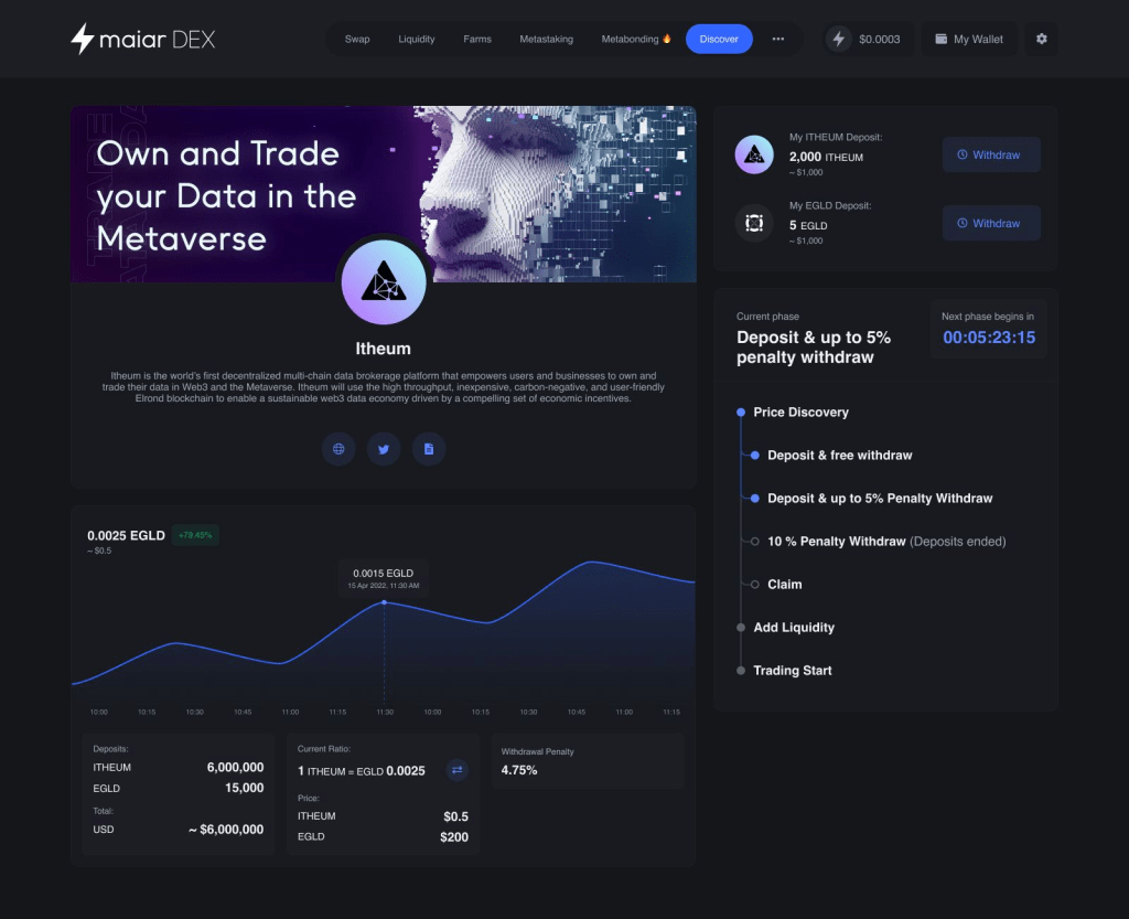 Phase 4 : La phase de découverte des prix se termine et le ratio EGLD/ITHEUM est établi. Le retrait des dépôts initiaux n’est plus possible. Les participants à la découverte des prix peuvent désormais échanger leur achat sous forme de jetons verrouillés.