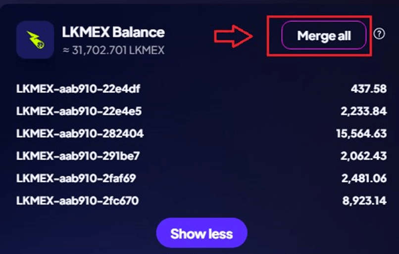 Vous pouvez utiliser la fonction « Fusionner » via Eldar Finance. Avec cette fonction, vous pouvez réduire le nombre de jetons LKMEX différents dans votre portefeuille.