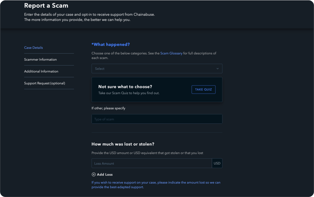 Le dépôt d’un rapport peut se faire en quelques étapes faciles en suivant ce lien : https://www.chainabuse.com/report