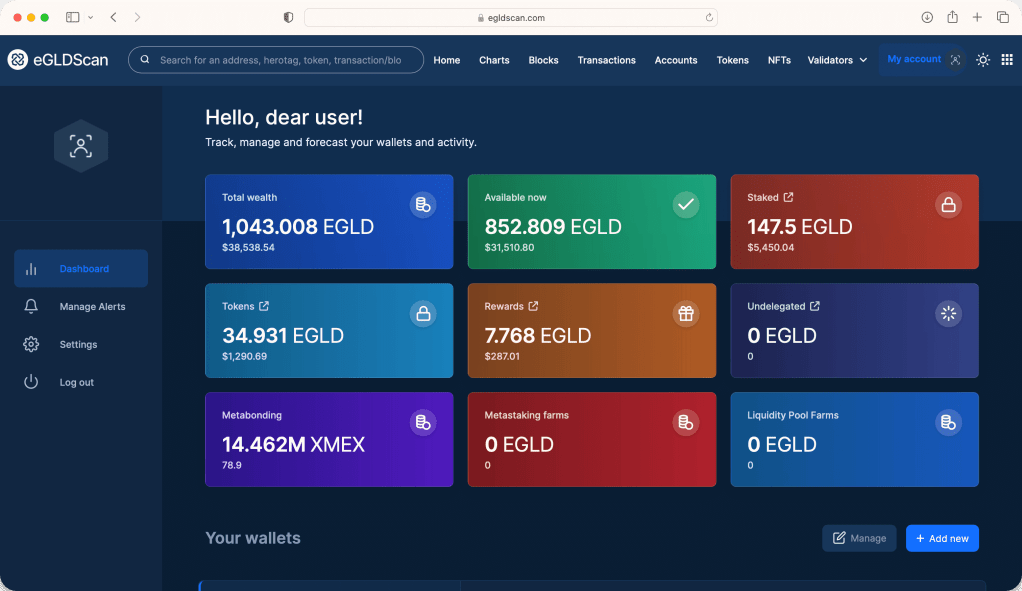 Le tableau de bord personnalisé disponible après la connexion présente un résumé de l’état du portefeuille et des raccourcis pour accéder aux données historiques sur les transactions, le jalonnement, les ESDT et plus encore. eGLDScan permet également d’ajouter plusieurs adresses sous le même tableau de bord, simplifiant le suivi de toutes les données associées.